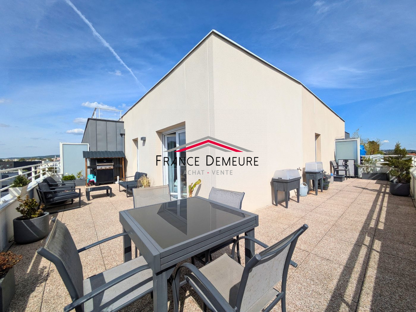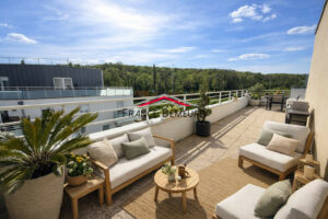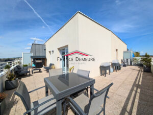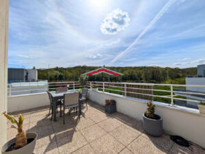 Dès l’entrée, vous découvrez un bel espace de vie lumineux avec une cuisine ouverte aménagée et équipée, le tout donnant accès à une magnifique terrasse de 49 m² sans vis-à-vis, véritable pièce de vie supplémentaire, idéalement exposée sud-ouest pour profiter pleinement des beaux jours.