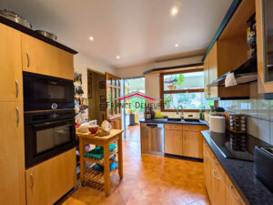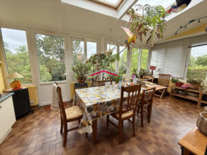 - Dès l’entrée, une terrasse accueille les visiteurs et mène à un vaste hall distribuant les pièces principales. Le séjour lumineux de 35 m², avec cheminée, s’ouvre sur une véranda aménagée en salle à manger, prolongeant l’espace de vie vers le jardin arboré. Attenante, la cuisine contemporaine, entièrement équipée, forme un ensemble chaleureux et fonctionnel, idéal pour les moments en famille.
