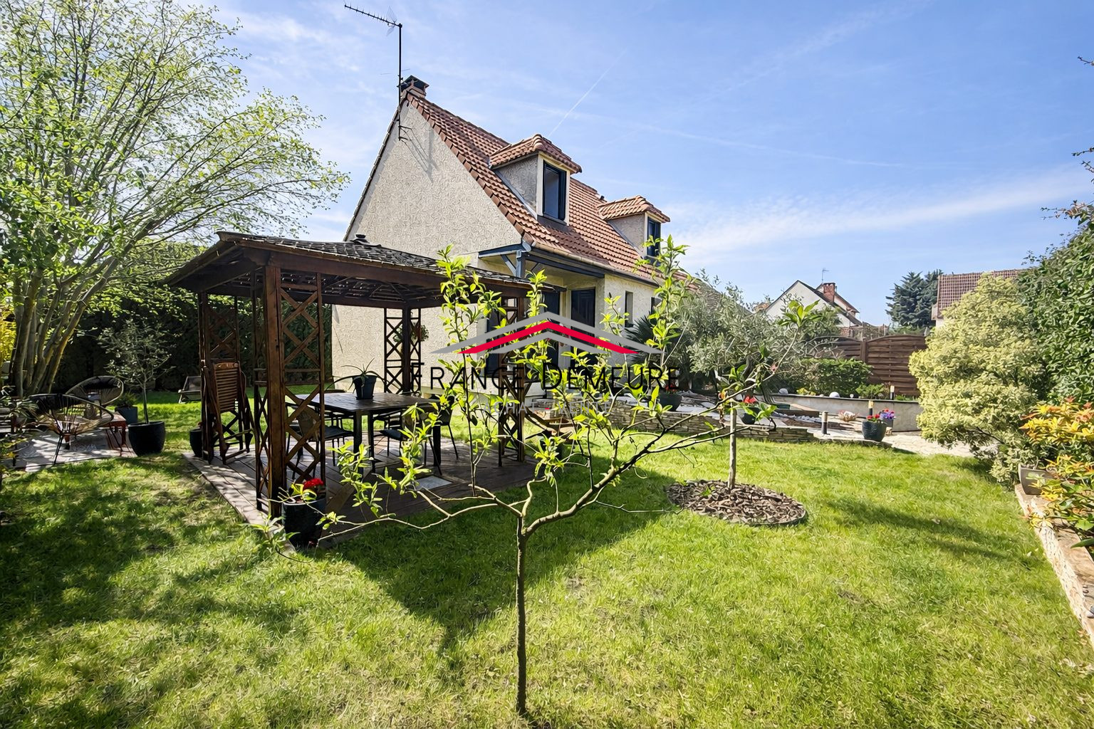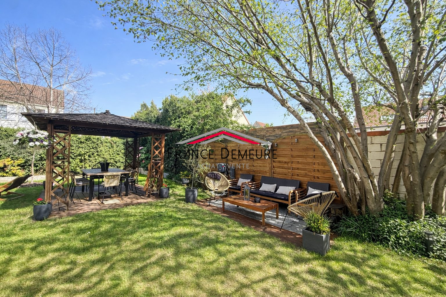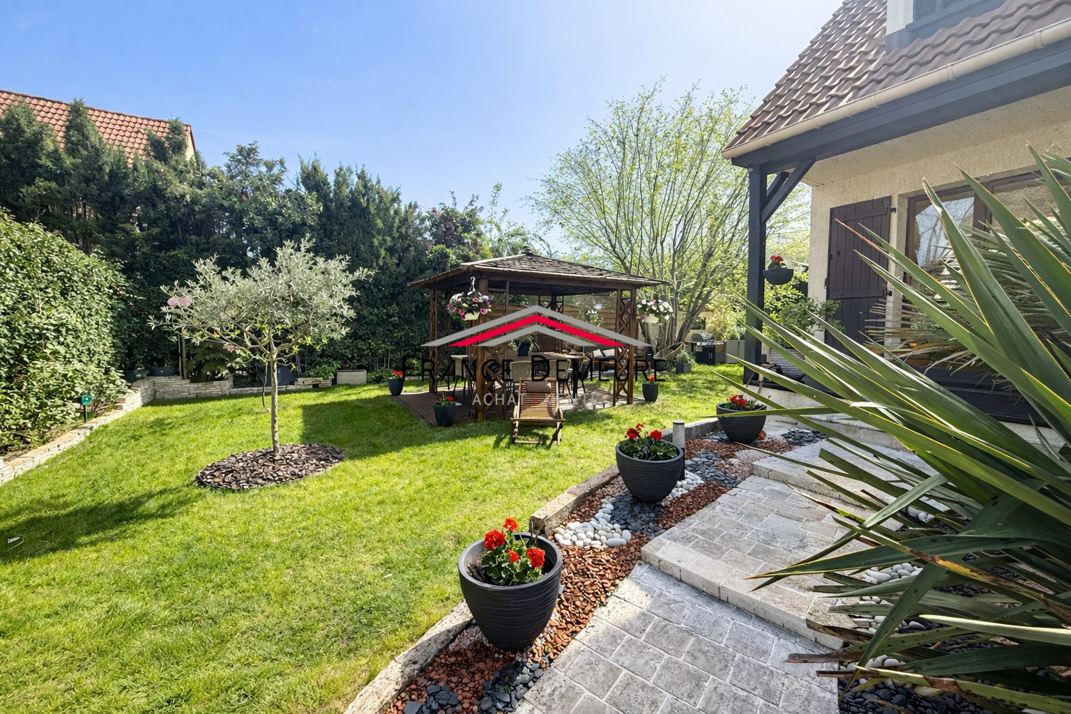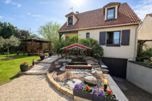 À l’extérieur, le jardin clos et arboré de 460 m², soigneusement entretenu, offre un environnement paisible agrémenté d’une pergola, idéal pour profiter des beaux jours en toute intimité.